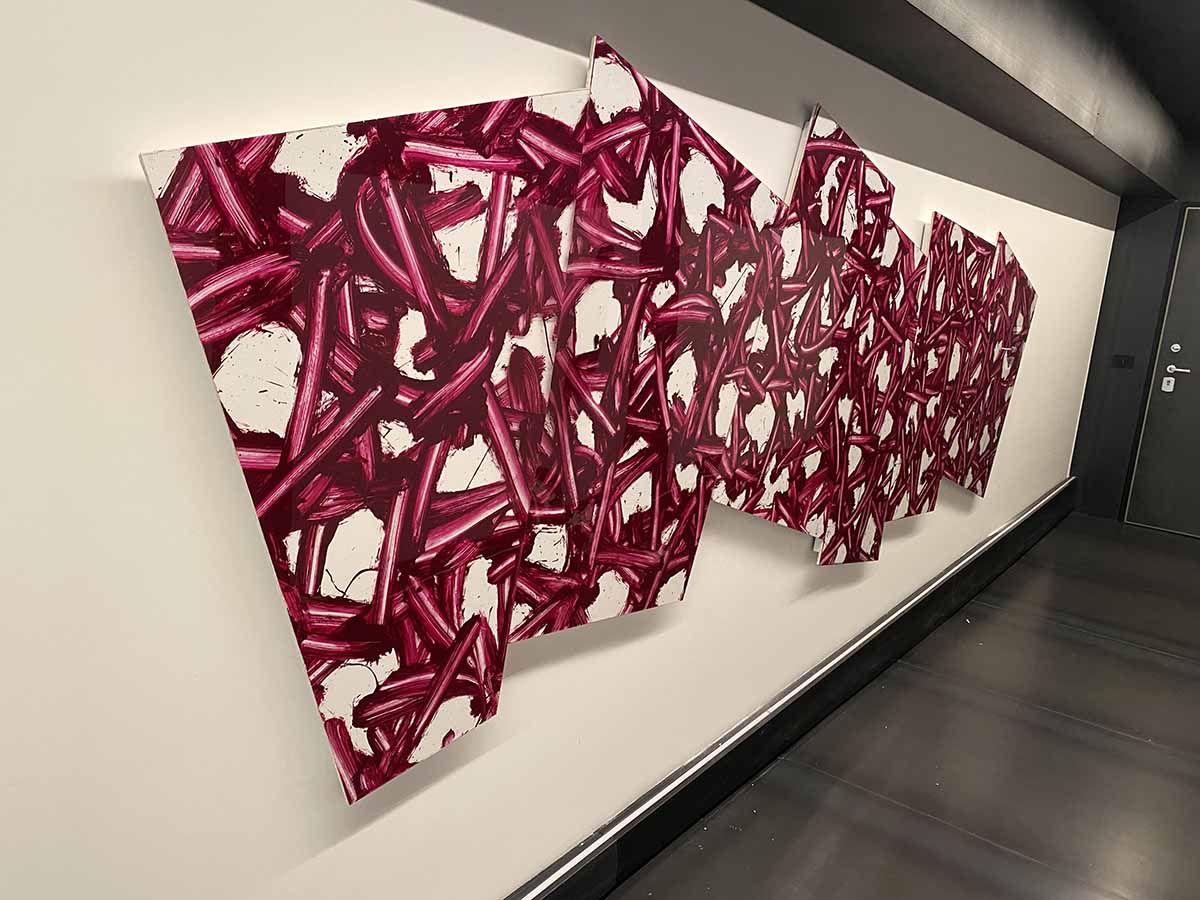 In questa poderosa opera polittica, Asdrubali dispiega una pittura che invade lo spazio come energia pura, proiettandosi oltre i confini della superficie. I pannelli sagomati amplificano la tensione visiva: il colore – un magenta profondo – si imprime come gesto impulsivo, ripetuto, urtante, che lotta con la forma e la moltiplica.