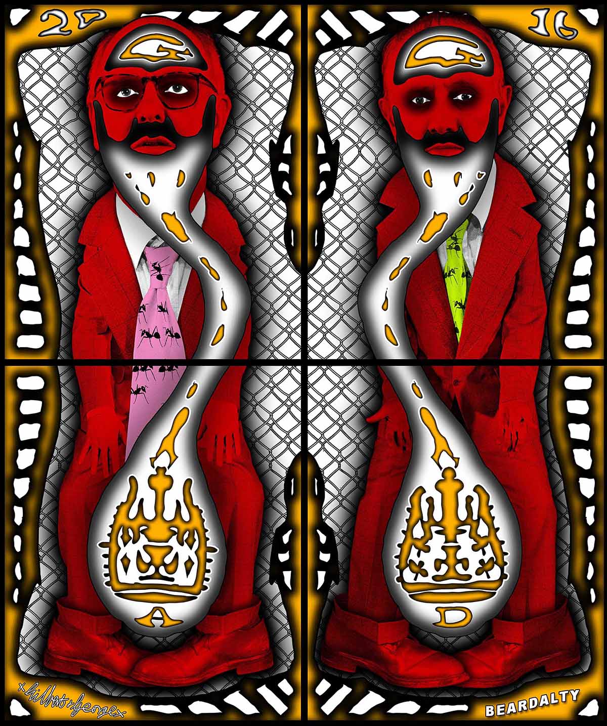 In Beardalty, Gilbert & George si sdoppiano, si specchiano, si elevano in un’immagine dove il corpo si fa icona e il volto si trasfigura. Il fondo a reticolo nero, le cromie incendiarie e i dettagli digitali costruiscono un universo pop e solenne al tempo stesso, dove simboli crudi si intrecciano a un’estetica da vetrata contemporanea.